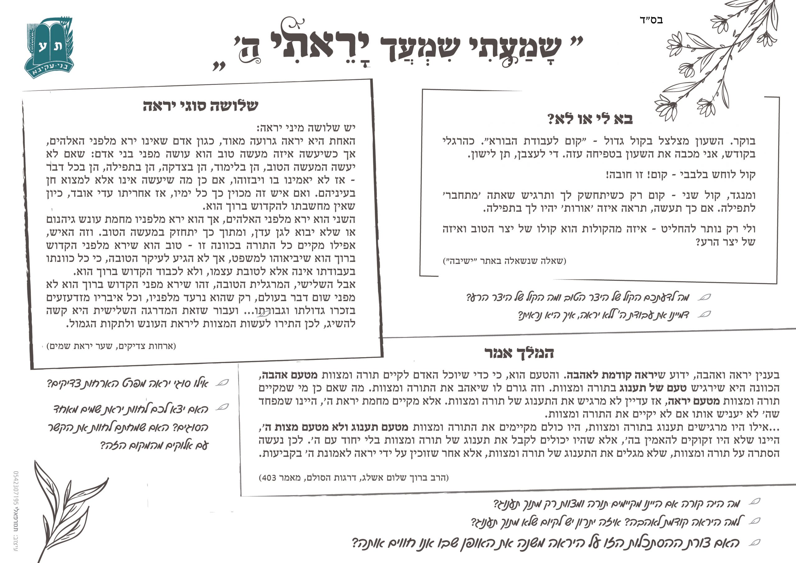 בשבוע שעבר פתחנו את הלימוד בהיכרות עם התשובה. כבר בגמרא ישנם דיונים על סוגים שונים של תשובה: תשובה מאהבה ותשובה מיראה. בלימוד זה נכיר את היראה על צדדיה השונים ואת חשיבותה בעבודת השם.