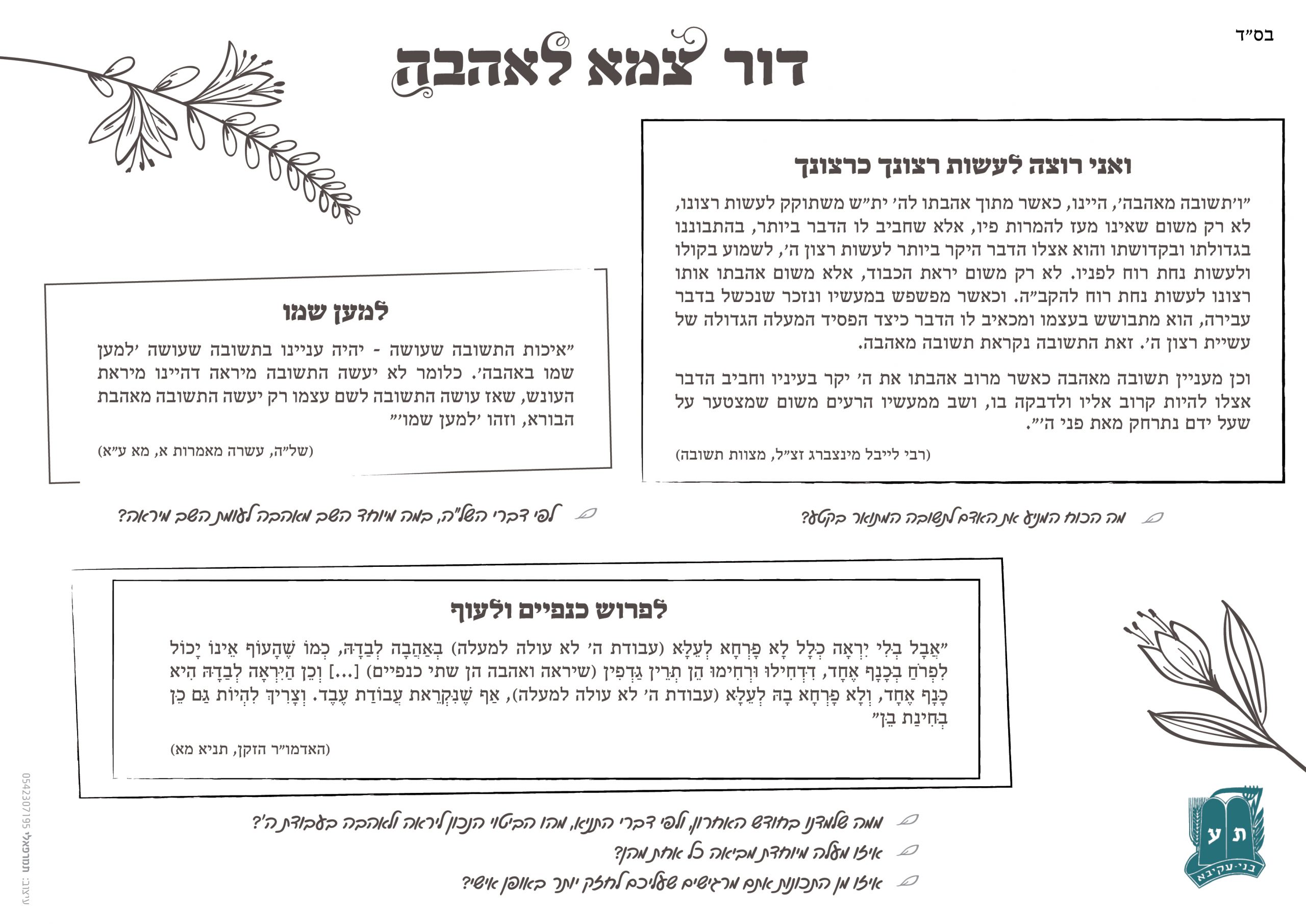 הנושא השנתי שלנו כתנועה הוא "מצווה ועושה". במהלך השנה נחנך למחויבות ולחיבור עמוק שלנו למצוות, ובחודשים אלול ותשרי אנו מבררים את התודעה הזו באמצעות בירור המושגים 'יראה' ו'אהבה' במצוות התשובה. בשבוע שעבר הכרנו את האהבה ואת חשיבותה בעבודת השם. הפעם נלמד על תשובה מאהבה ונדון בשייכות שלנו לתשובה זו.