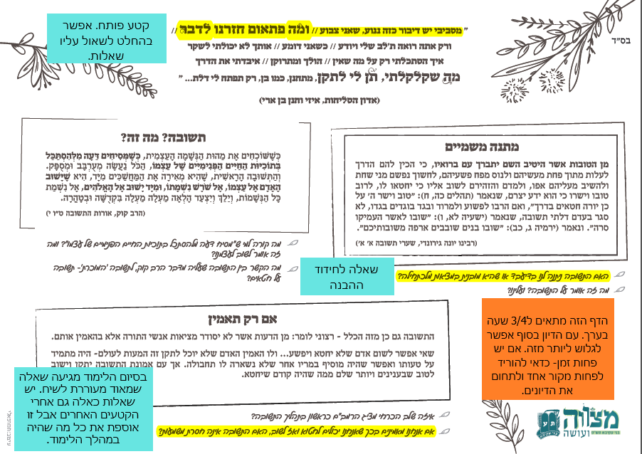 קטעי לימוד: יש לשים לב שהם תואמים את הרמה והסגנון של הלומדים ושהם מתאימים לזמן המוקדש ללימוד. מעבר לקריאה ולהבנה של הקטעים חשוב להשאיר זמן לשיח בעקבותיהם העולה מהשאלות המנחות.