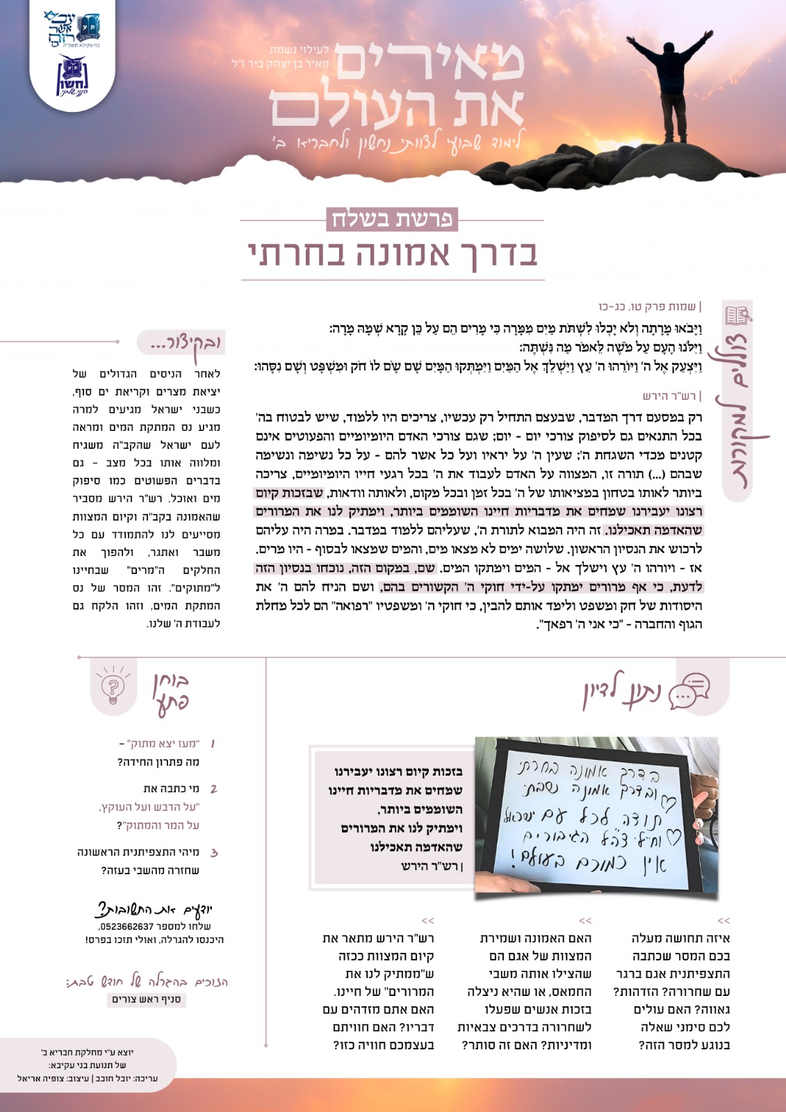 לאחר הניסים הגדולים של יציאת מצרים וקריאת ים סוף, כשבני ישראל מגיעים למרה מגיע נס המתקת המים ומראה לעם ישראל שהקב"ה משגיח ומלווה אותו בכל מצב – גם בדברים הפשוטים כמו סיפוק מים ואוכל. רש"ר הירש מסביר שהאמונה בקב"ה וקיום המצוות מסייעים לנו להתמודד עם כל משבר ואתגר, ולהפוך את החלקים ה"מרים" שבחיינו ל"מתוקים". זהו המסר של נס המתקת המים, וזהו הלקח גם לעבודת ה' שלנו.