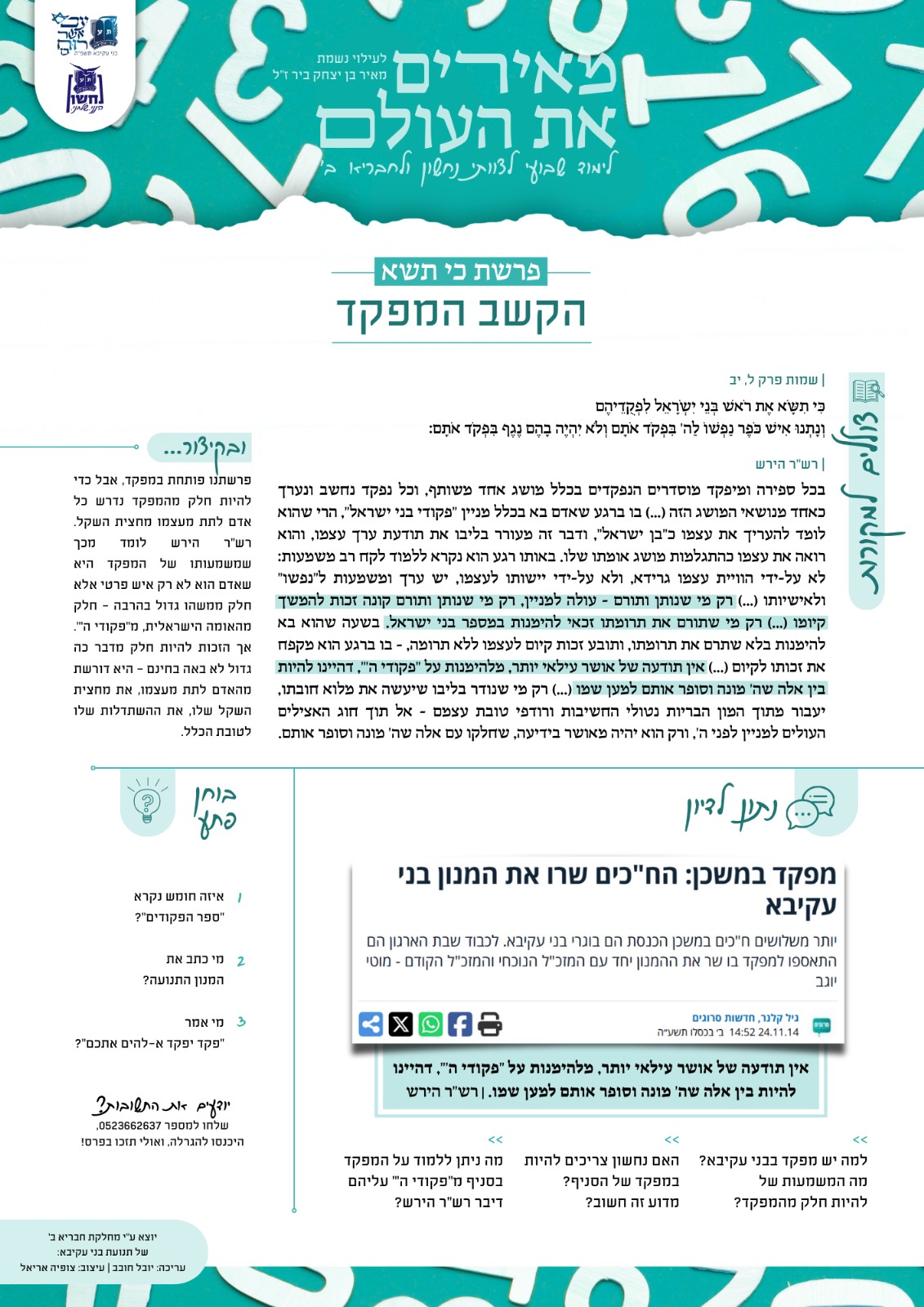 פרשתנו פותחת במפקד, אבל כדי להיות חלק מהמפקד נדרש כל אדם לתת מעצמו מחצית השקל. רש"ר הירש לומד מכך שמשמעותו של המפקד היא שאדם הוא לא רק איש פרטי אלא חלק ממשהו גדול בהרבה – חלק מהאומה הישראלית, מ"פקודי ה'". אך הזכות להיות חלק מדבר כה גדול לא באה בחינם – היא דורשת מהאדם לתת מעצמו, את מחצית השקל שלו, את ההשתדלות שלו לטובת הכלל.