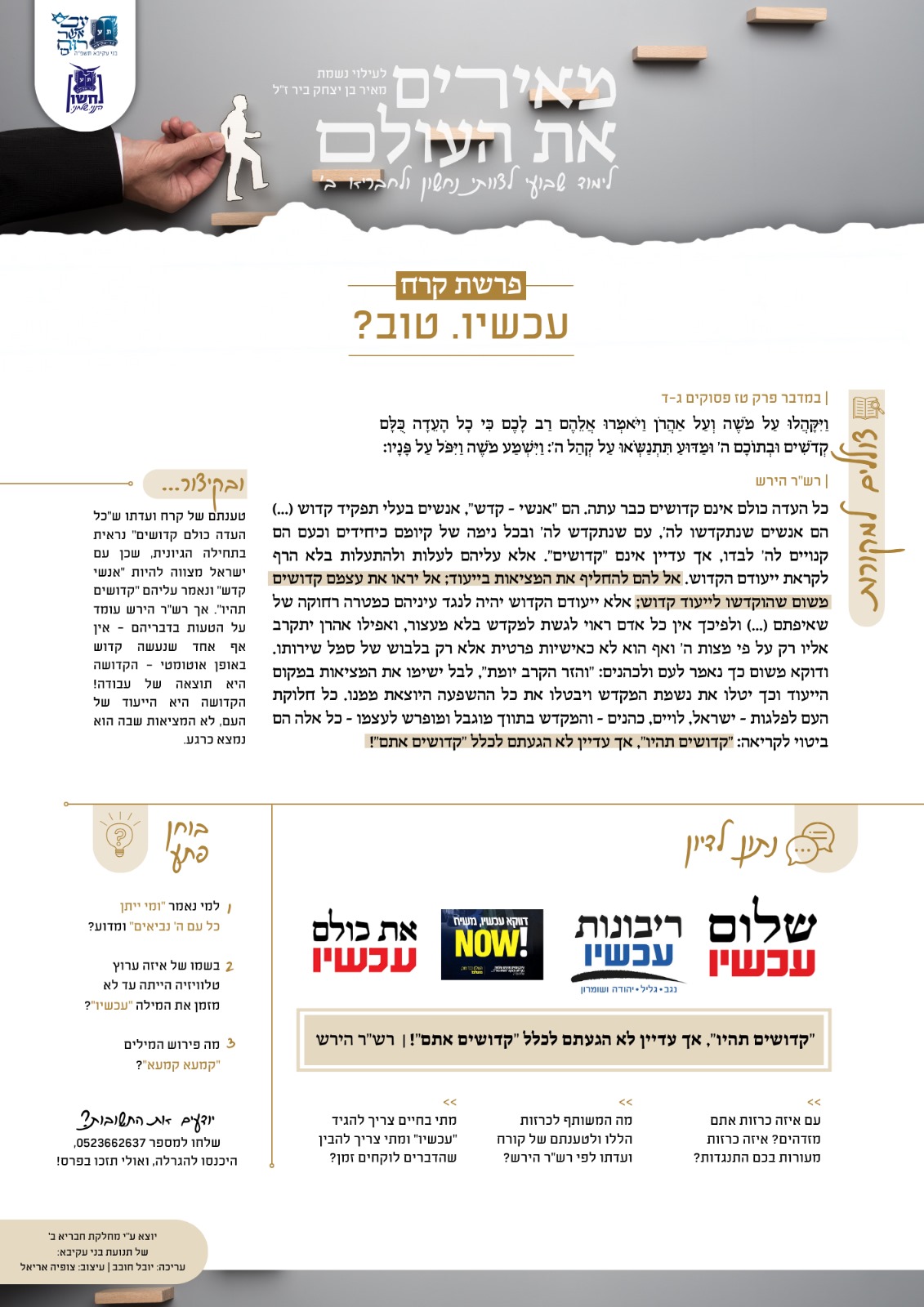 טענתם של קרח ועדתו ש"כל העדה כולם קדושים" נראית בתחילה הגיונית, שכן עם ישראל מצווה להיות "אנשי קדש" ונאמר עליהם "קדושים תהיו". אך רש"ר הירש עומד על הטעות בדבריהם – אין אף אחד שנעשה קדוש באופן אוטומטי – הקדושה היא תוצאה של עבודה! הקדושה היא הייעוד של העם, לא המציאות שבה הוא נמצא כרגע.