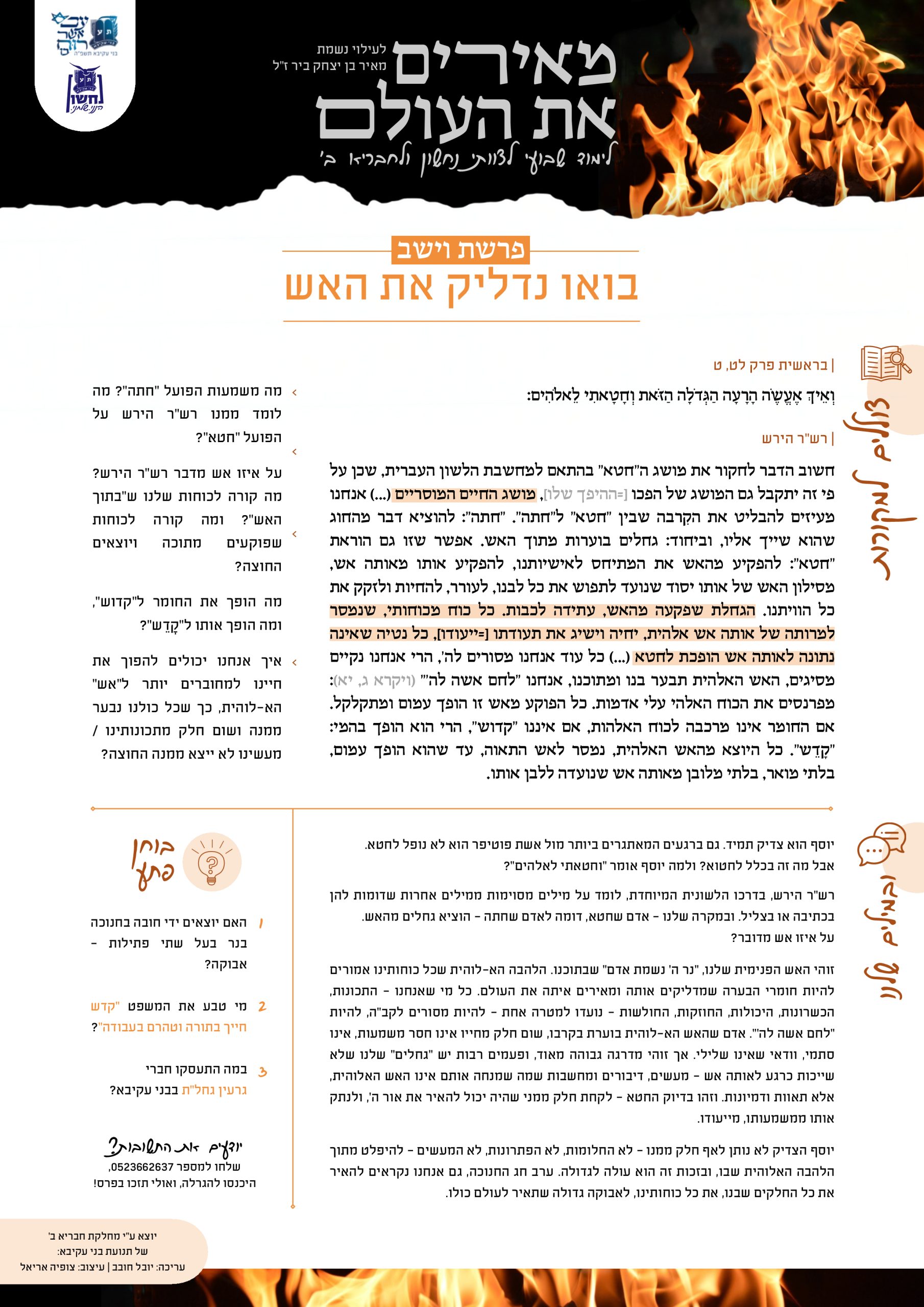 זוהי האש הפנימית שלנו, "נר ה' נשמת אדם" שבתוכנו. הלהבה הא-לוהית שכל כוחותינו אמורים להיות חומרי הבערה שמדליקים אותה ומאירים איתה את העולם. כל מי שאנחנו – התכונות, הכשרונות, היכולות, החוזקות, החולשות – נועדו למטרה אחת – להיות מסורים לקב"ה, להיות "לחם אשה לה'". אדם שהאש הא-לוהית בוערת בקרבו, שום חלק מחייו אינו חסר משמעות, אינו סתמי, וודאי שאינו שלילי. אך זוהי מדרגה גבוהה מאוד, ופעמים רבות יש "גחלים" שלנו שלא שייכות כרגע לאותה אש – מעשים, דיבורים ומחשבות שמה שמנחה אותם אינו האש האלוהית, אלא תאוות ודמיונות. וזהו בדיוק החטא – לקחת חלק ממני שהיה יכול להאיר את אור ה', ולנתק אותו ממשמעותו, מייעודו.