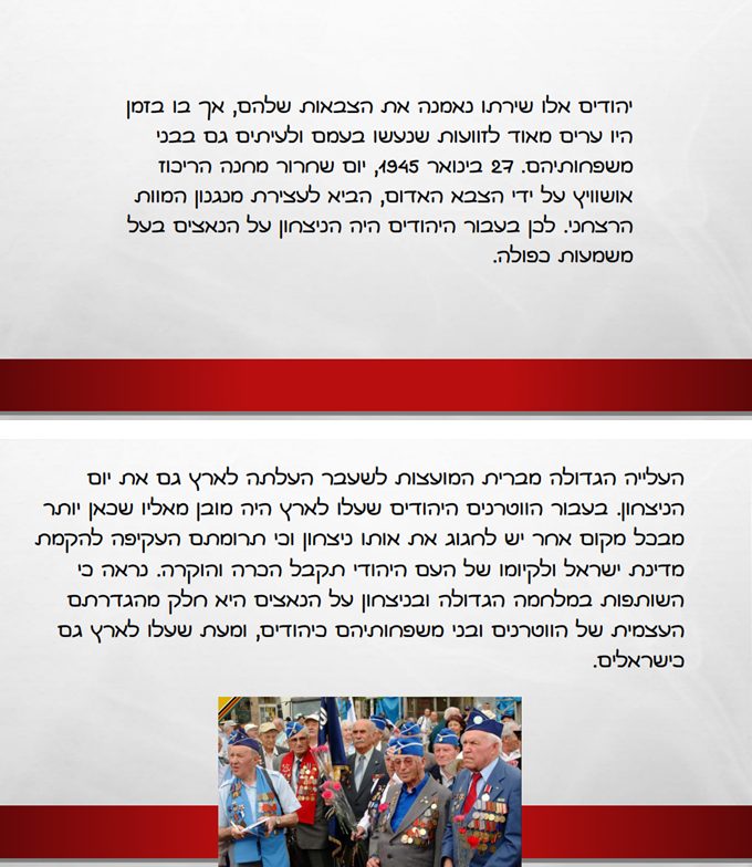 ב-9 במאי נוהגים לחגוג את "יום הניצחון" – ניצחון בעלות הברית בכלל, והצבא האדום בפרט, על גרמניה הנאצית במלחמת העולם השנייה. ביום זה מעלים על נס את תרומתם של 1.5 מיליון היהודים שלחמו במלחמת העולם השנייה בצבאות בעלות הברית וביחידות הפרטיזנים, ובהם חצי מיליון יהודים שלחמו בצבא האדום של רוסיה הסובייטית. גבורתם, אומץ ליבם ומאבקם כיהודים למען אחיהם הנתונים בצרה הינם פיסת היסטוריה משמעותית בזהות של כולנו.
