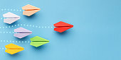 פעולהה ← Previous Next → Opinion leadership concept. Red paper plane leading another colorful ones, influencing the crowd, blue background, panorama