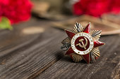 20 ← Previous Next → Victory Day.Selective focus on the Order of the Red Star with the russian inscription Patriotic war on a wooden background with red carnations.Celebration on may 9.Memorial day.Greeting card.copyspace